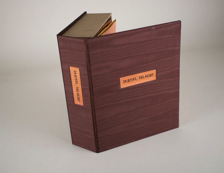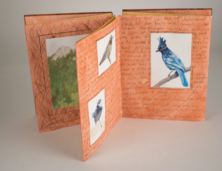 An eight panel accordion on which stream of consciousness ink writing and watercolor paintings commemorate a too long postponed first camping trip of 2023. Covers are leather wrapped boards with recessed labels. One label is a watercolor painting protected with mica, the other is laser printed on treated paper. Housed in a custom drop-spine box that contains plant and mineral specimens protected with plexiglass.