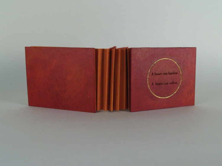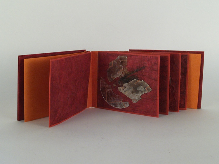 Five stiff leaf pages + 2 end sheets are sewn onto a concertina spine. Covers are individually attached via split board technique allowing the exposed concertina spine to expand for display.