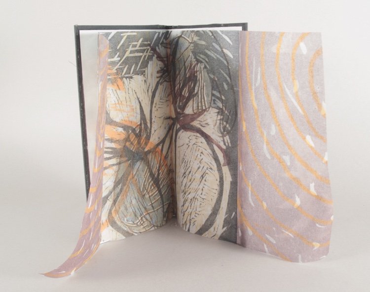 Single-signature case binding. Each volume consists of a 3 folio text block; the first folio acts as decorative endpage, handprinted on translucent paper, the second holds the the text, the third is a gatefold print on transluent HMP paper.
