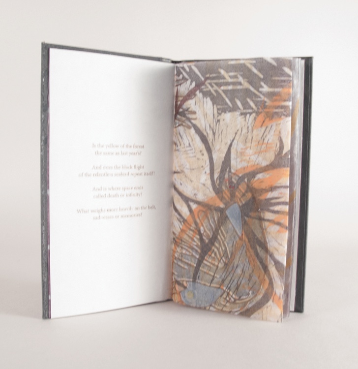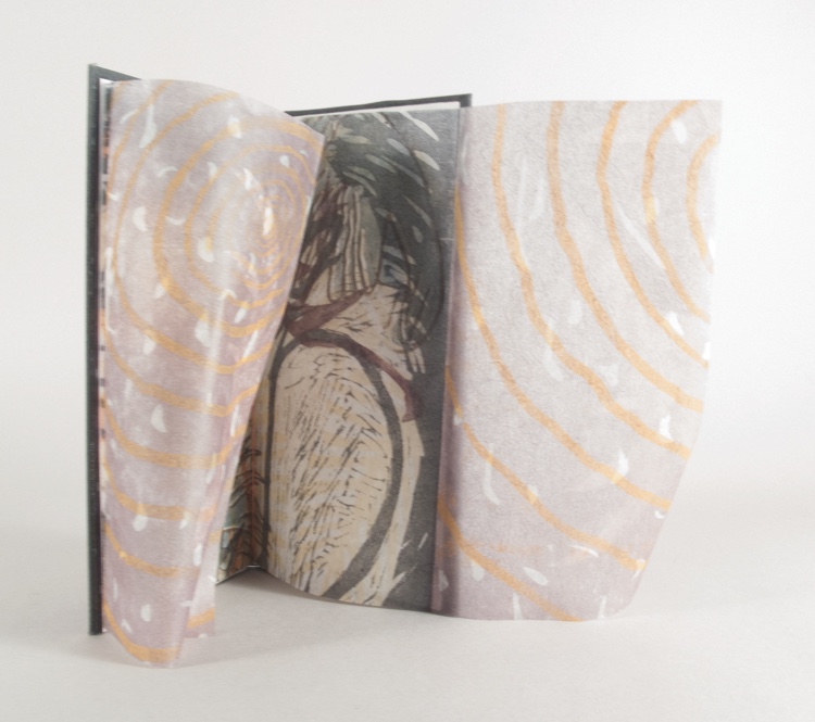 I’d been experimenting with various combinations of imagery and presentation for these texts since 2010. A week spent with Karen Kunc at Constellation Studios in 2014 followed by several weeks in the studio resulted in the right combination of print method and presentation for this ongoing series. Images are woodblock and pochoir printed from several plates. Text is laser etched on a paper ‘sandwich’ made of an inner core of Moriki Japanese HMP, faced on each side with cotton text weight paper. The etching exposes a hint of the color of the Moriki core and is variable within the edition. Paste downs are book cloth handprinted from wood blocks. Bound as a pamphlet in a German case binding. Spine is printed leather skiver.