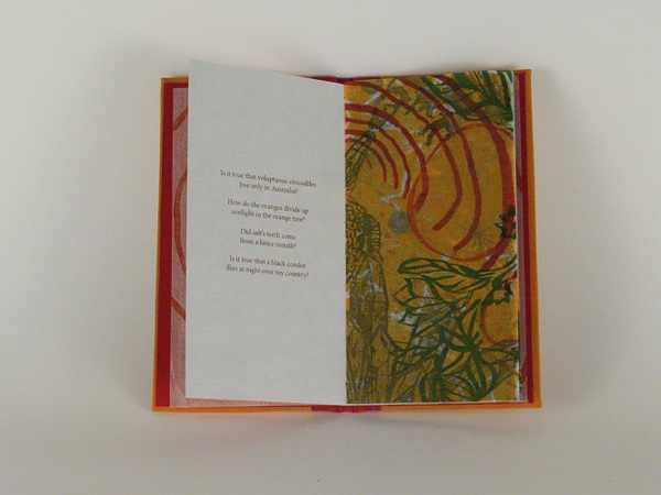 Single-signature case binding. Each volume consists of a 3 folio text block; the first folio acts as decorative endpage, handprinted on translucent paper, the second holds the the text, the third is a gatefold print on transluent HMP paper.