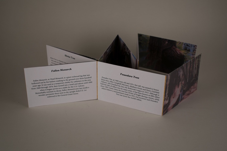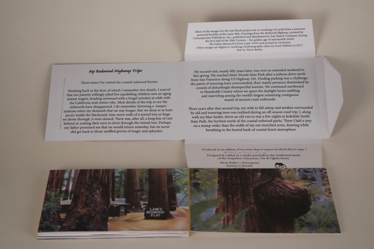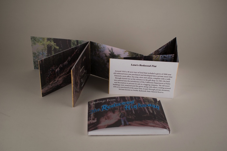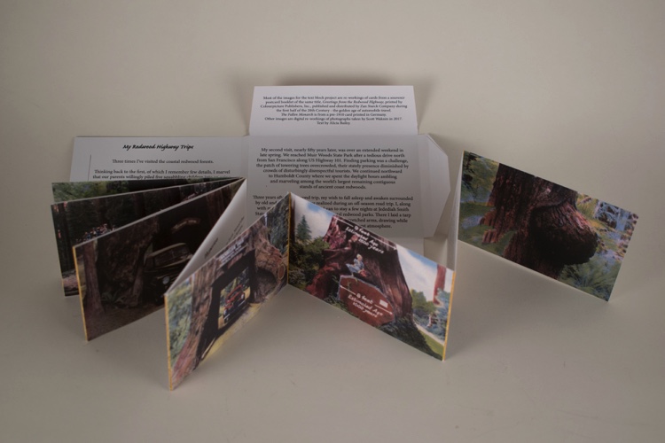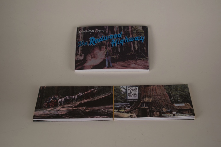 Greetings from the Redwood Highway is an accordion that pairs the format of postcard booklets, popular in the early 20th Century, with personal narrative and brief essays on the contemporary status of the areas depicted. The interior images were created using scans of original postcards ca. 1914-1935. The outer wrapper uses a contemporary photograph digitally manipulated to mimic early 20th century colortone postcards. Postcard booklets were especially popular from the 1940s through the 1970s, an era when you could put a postage stamp on just about anything and it would get to its addressee.