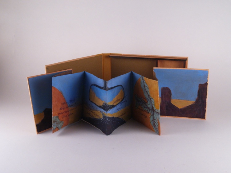 8 panel (including end pages) accordion book with hard covers, house in a box alongside the piece of petrified wood that provided a starting point for this work.