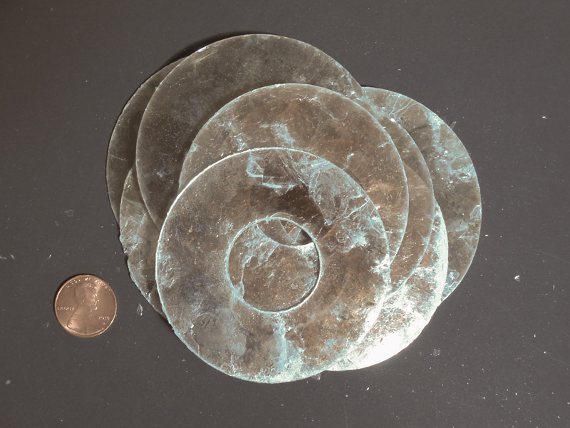 These mica washers were machine cut from sheets of mica. Each washer is comprised of many layers and can be easily split into thinner washers (I use a rounded metal palette knife for splitting). One thick piece can yield several thinner pieces. For this reason it is sold by weight, not the number of washers in a packet.