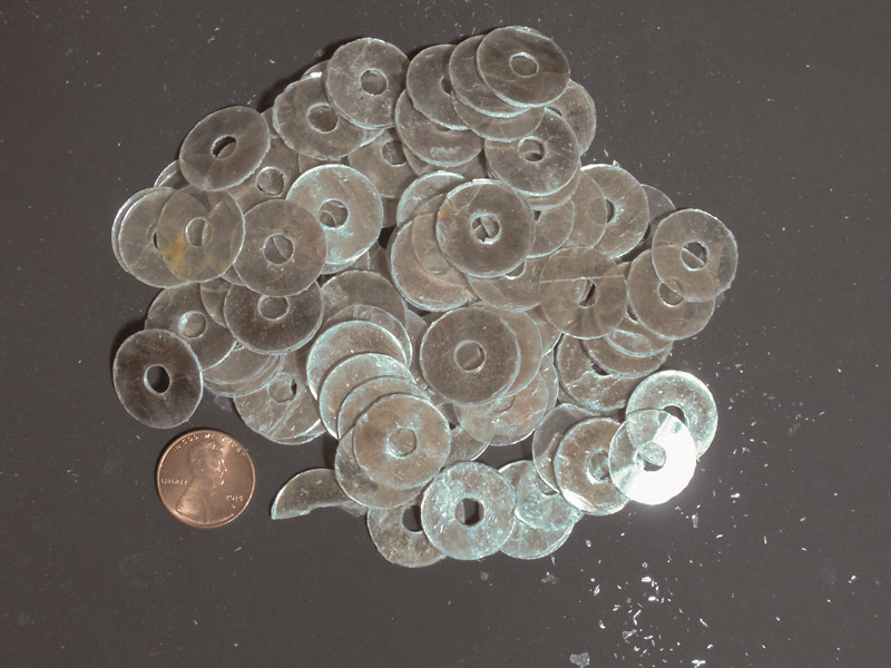 These mica washers were machine cut from sheets of mica. Each washer is comprised of many layers and can be easily split into thinner washers (I use a rounded metal palette knife for splitting). One thick piece can yield several thinner pieces. For this reason it is sold by weight, not the number of washers in a packet.
