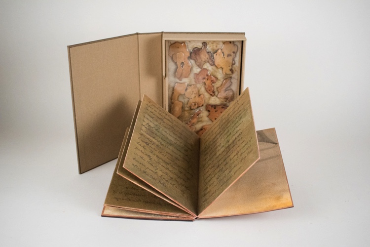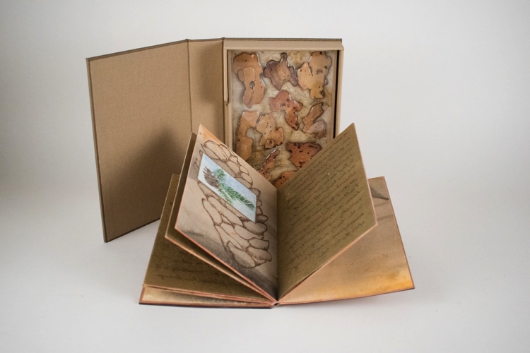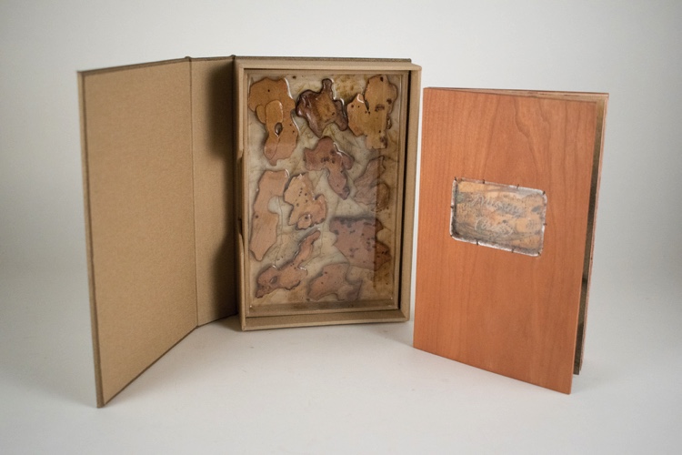 Missing (trees) presents memories of six trees from my past paired with small paintings in a hybrid structure (drum leaf + sewn in pages). The paintings (oil on prepared paper) are mounted on hand-dyed rag papers with walnut ink drawings. The texts are hand-written, also in walnut ink, on translucent, hand-dyed paper. Book covers are cherry, labels are etched mica. Housed in a custom drop spine box that has bits of bark cast in epoxy resin on the tray base with spine and cover labels of etched mica.