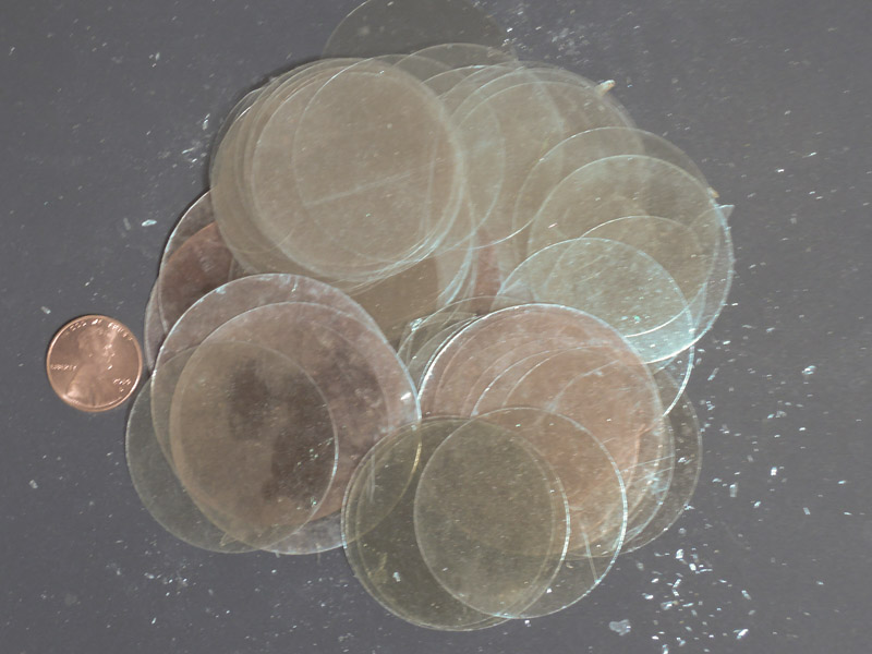 These mica discs have been thinned and are nearly transparent. Each packet has a variety of thicknesses, and tones (warmish gray or greenish).