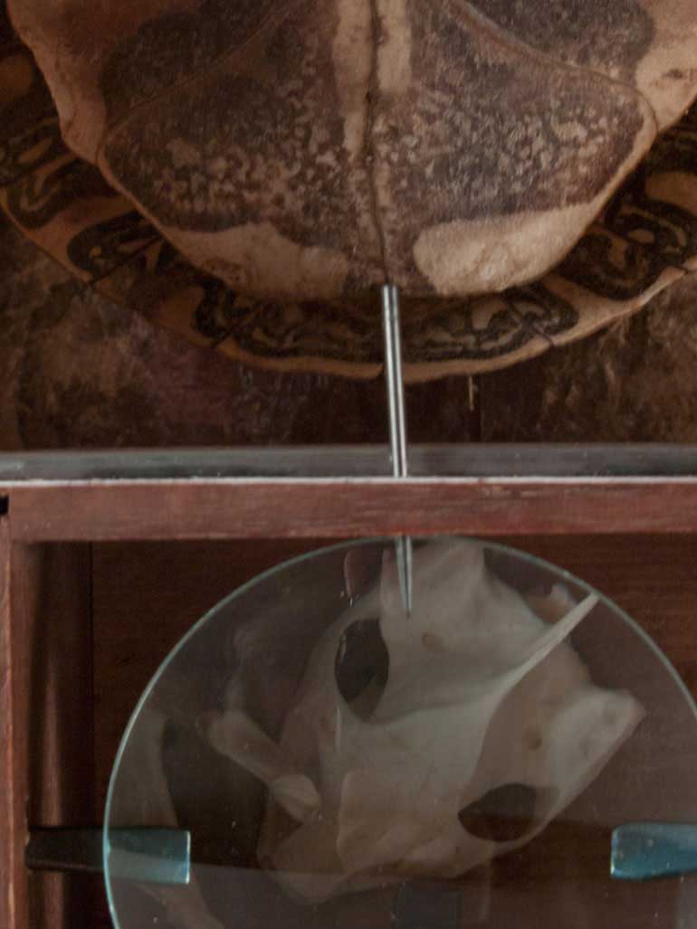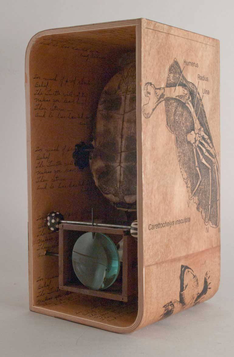 This box is part of the Lovely and Amazing series. It is wrapped on the inside with surface treated laser print copies from Ruth’s scrapbook collection of handwritten poetry. The outside is wrapped with laser print copies of scans from a text and images about reptiles that have been tinted and coated with pigmented wax. Inside the box is a turtle shell. Suspended above the base is a wooden box that houses a turtle skull and magnifying lens. The top surface of that box has a photograph an inkjet reprint of black and white photograph of myself as a child watching a turtle stroll across Ruth’s back yard. Glazed with cast acrylic on front surface.
