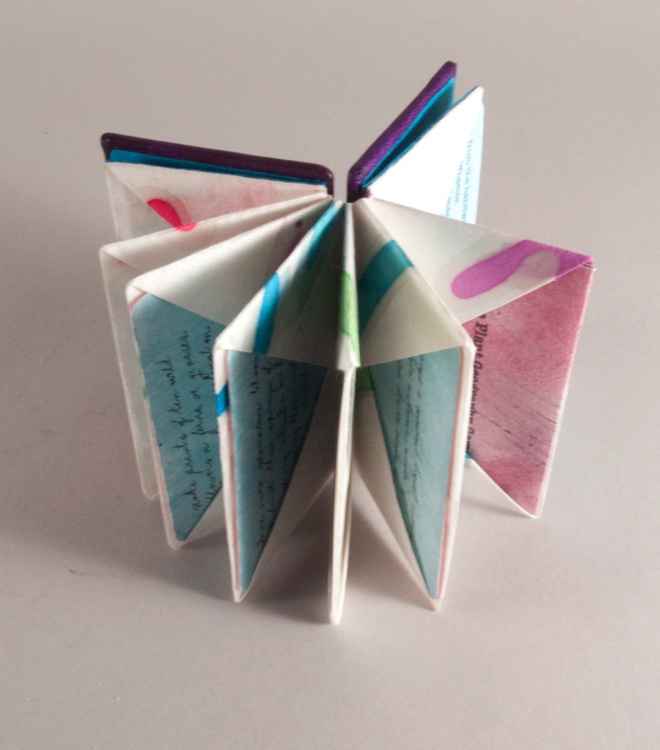 paper, photographs, starch paste, acrylic, book cloth, book board, wax, pigment, laser foil, laser transfer, goat, metal foil, plastic, plant specimens